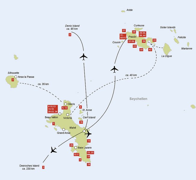 Знайте, что длительные переезды по океану (например, из Маэ на Праслин 2ч) могут вызвать морскую болезнь, поэтому мы рекомендуем летать из о. Маэ на другие острова.