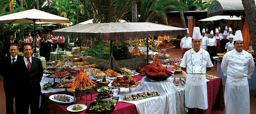 К роскошному лобби отеля примыкает бар Bandiere. Гостям отеля Castello предлагается завтрак и ужин в ресторане Cavalieri, они также могут ужинать в ресторанах Forte Grill и La Pineta (бронирование столика не требуется). Гости номеров категории executive могут ужинать в ресторанах Le Dune и Belvedere без дополнительной платы, предварительно забронировав столик. В других ресторанах также требуется предварительное бронирование, дополнительная плата не взимается. Исключением являются рестораны высокой кухни и и a la carte, где требуется предварительное бронирование, а также предусмотрена дополнительная плата.