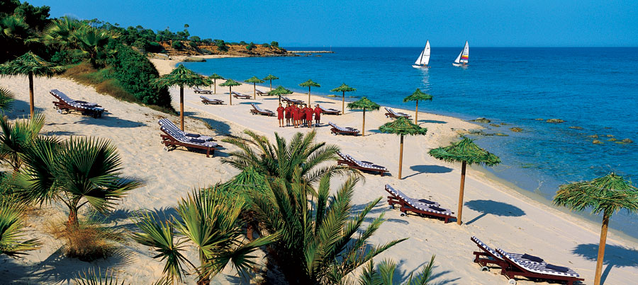 Пляж курорта — это полоса белого песка, расположенная между Пулой и Капо-Спартивенто у подножья гор, укрытая от остального мира. На пляже, защищенном от сильных ветров и жары, царит мягкий субтропичечкий микроклимат, благодаря которому температура воды на два градуса выше, чем в других частях острова. Журнал “Форбс” включил пляж Forte Village в число 25 самых очаровательных пляжей мира. Такие непохожие между собой пляжи и береговая линия в окрестностях Forte Village обладают только им присущим очарованием: бухта Киа с лагуной, которая идет параллельно морю и отделена от него узкой песчаной косой, бухта Чиполла с извилистой линией гранитных мысов и пляж Туэрредда с мельчайшим песком и яркими тропическими красками. Длинный и изогнутый, словно полумесяц, частный оборудованный песчаный пляж с плавным входом в воду и тростниковыми зонтами расположен в одном из красивейших девственных уголков Сардинии: журнал Forbes признал его одним из 25 самых очаровательных пляжей мира.