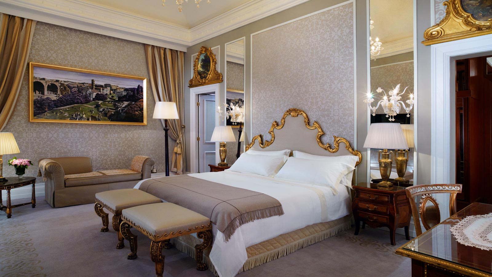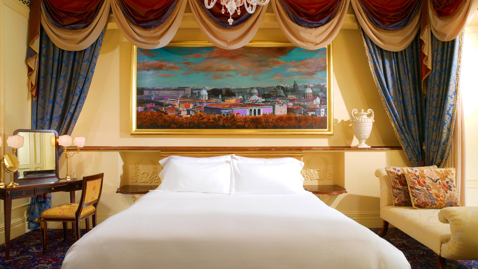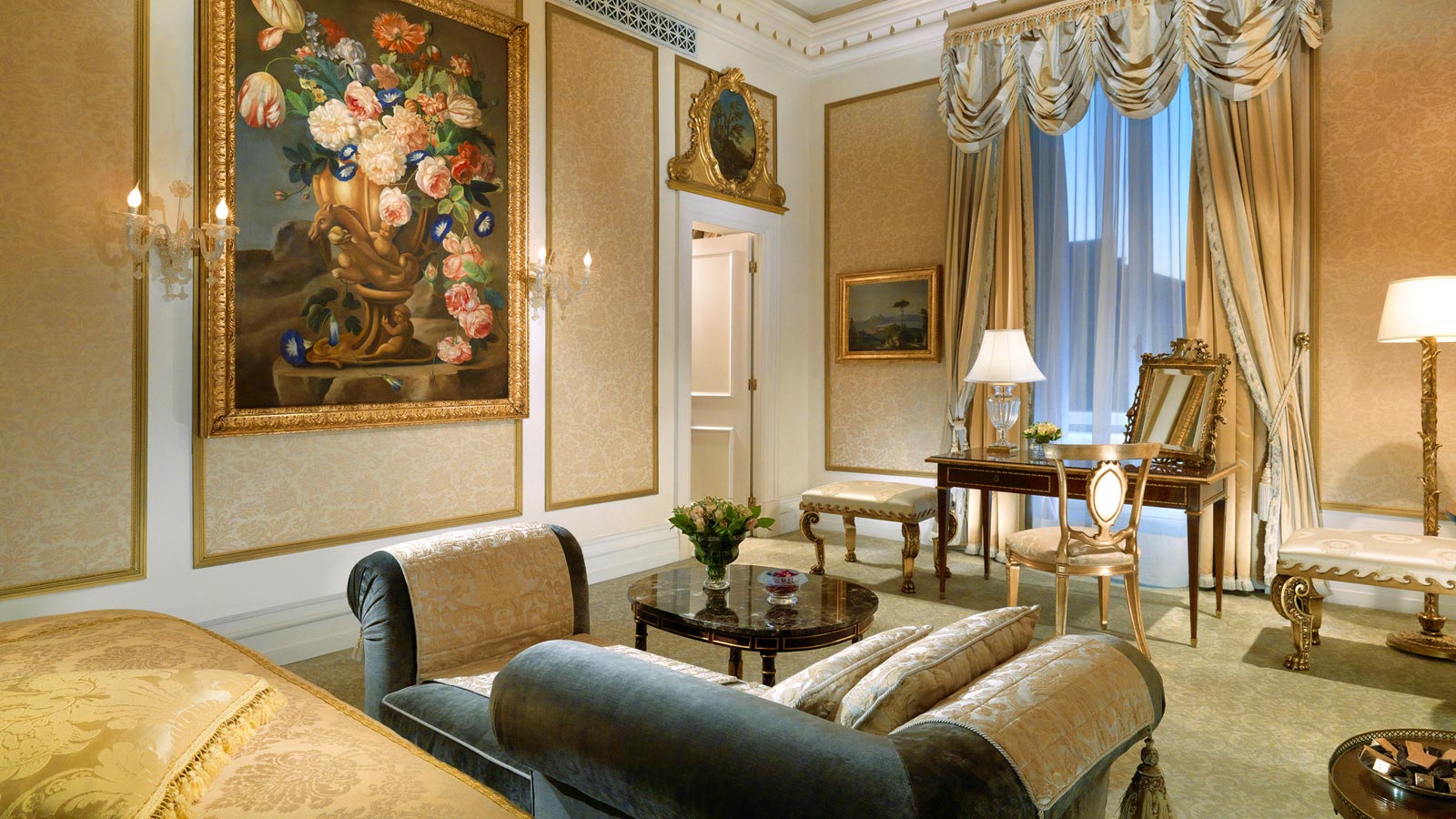 Расположенная на втором этаже St. Regis Rome, эта версия с одной кроватью может быть укомплектована двумя другими смежными спальнями и ванными комнатами в том же стиле, с общей площадью 150 кв. м.<br>