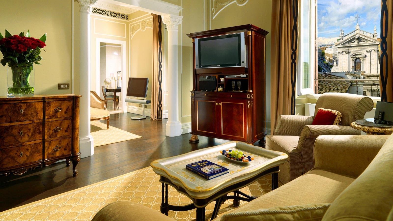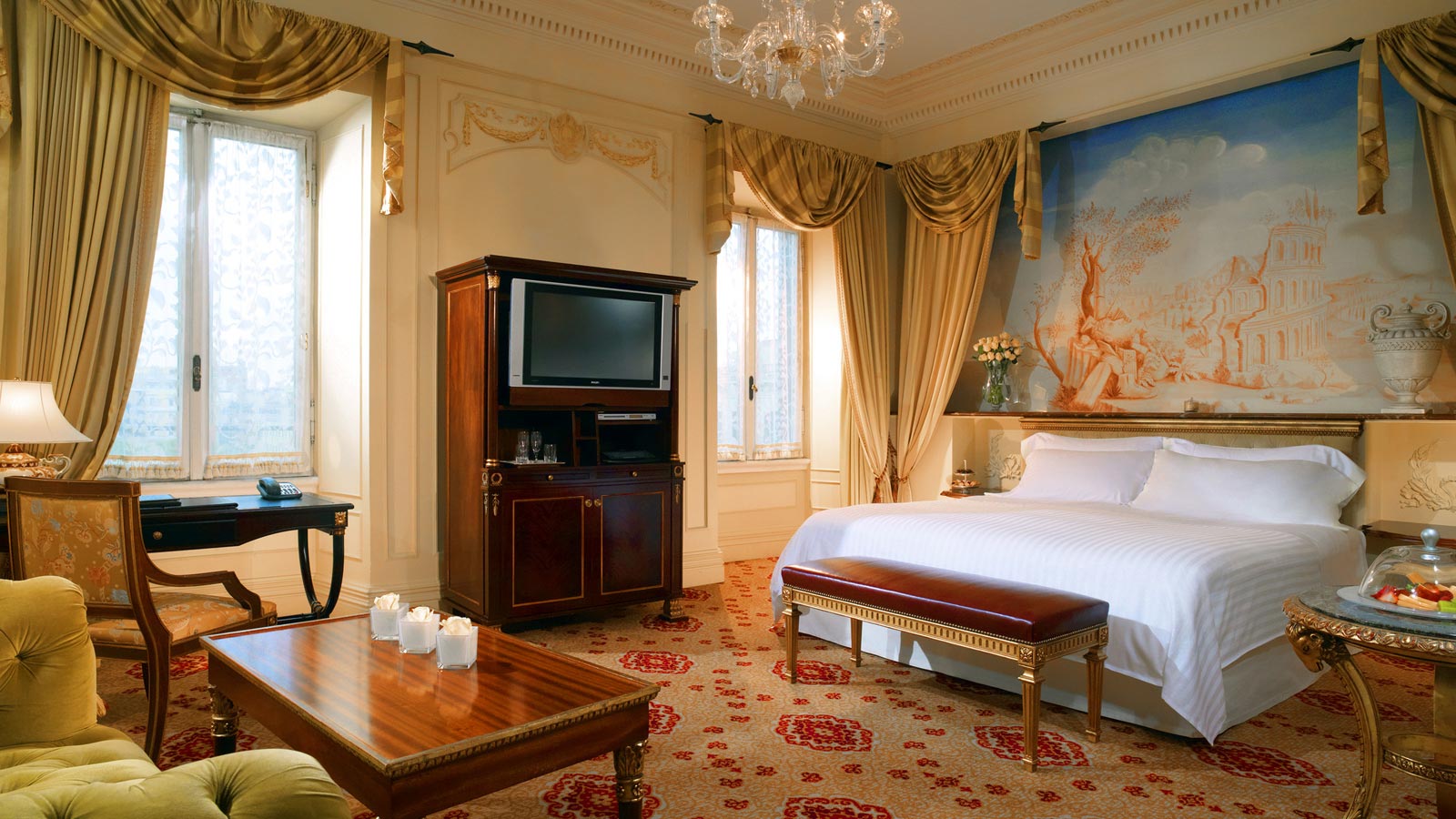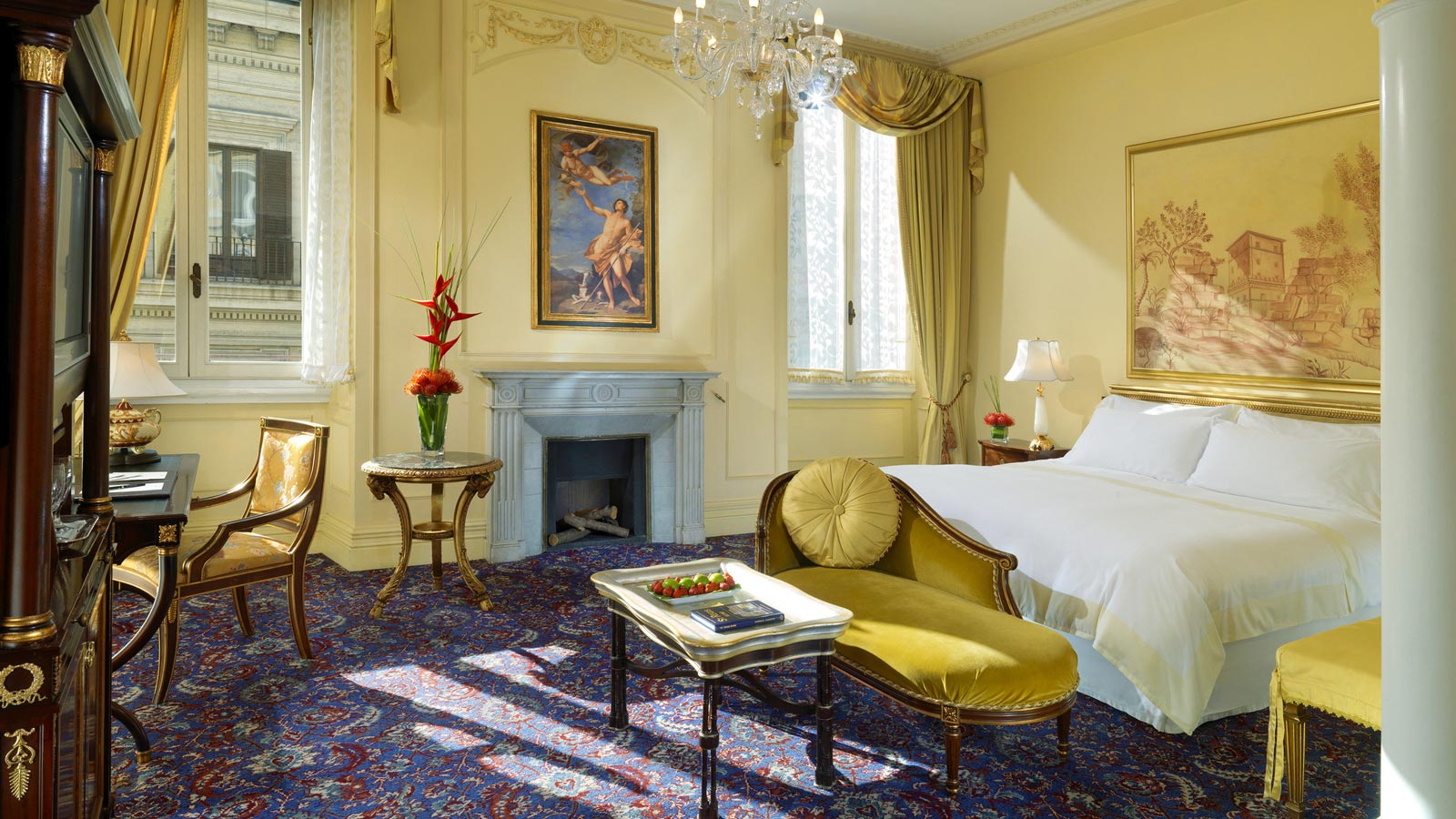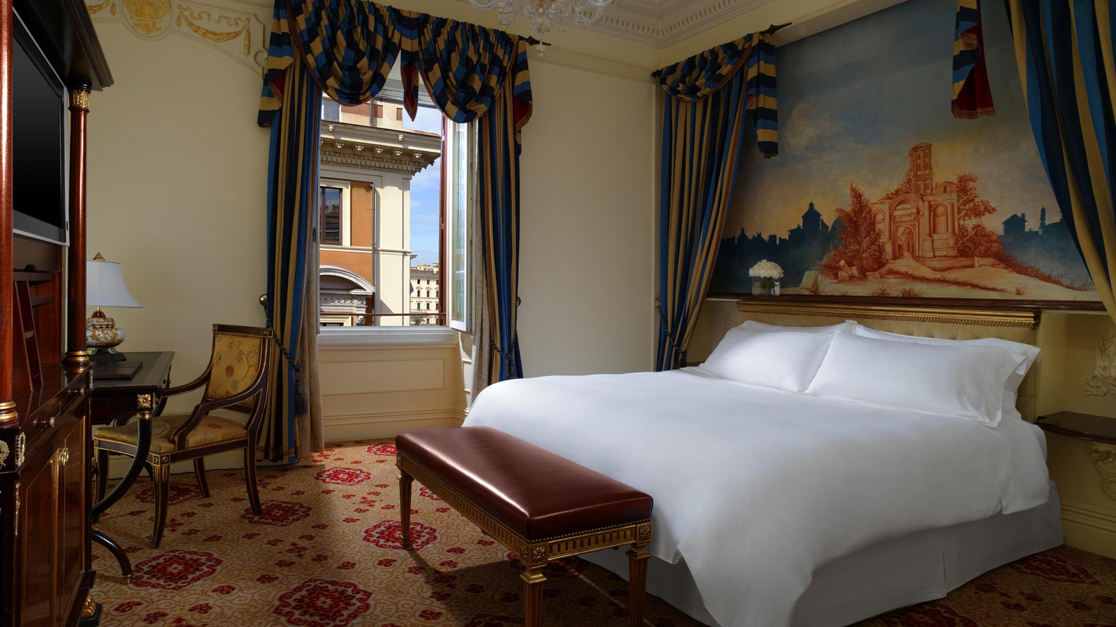 Расположенная на втором этаже St. Regis Rome, эта версия с одной кроватью может быть укомплектована двумя другими смежными спальнями и ванными комнатами в том же стиле, с общей площадью 150 кв. м.<br>