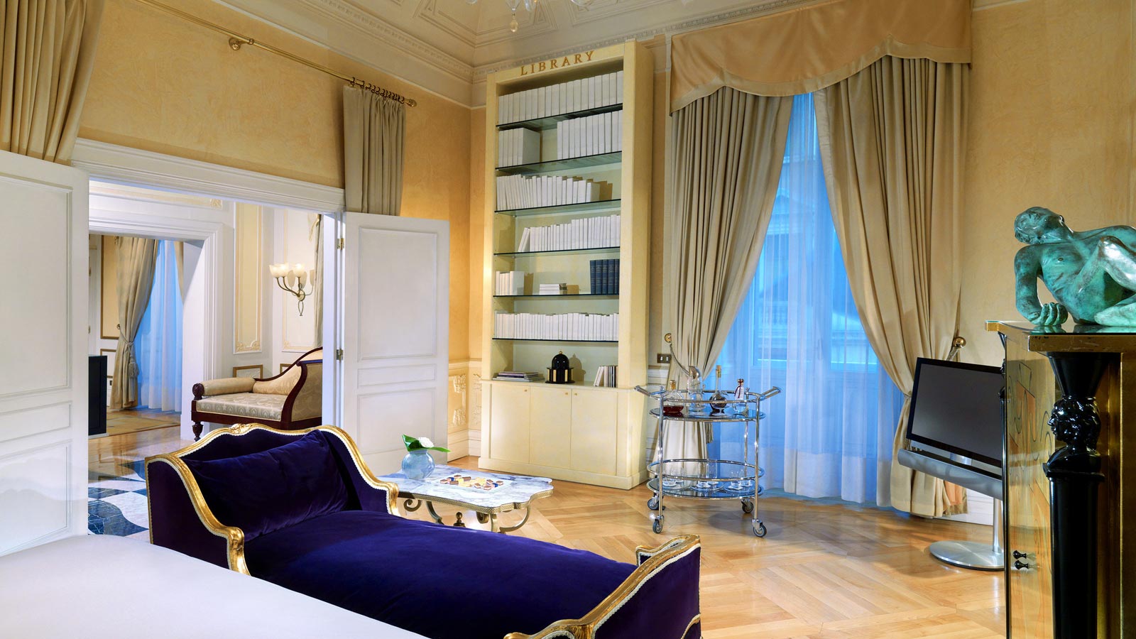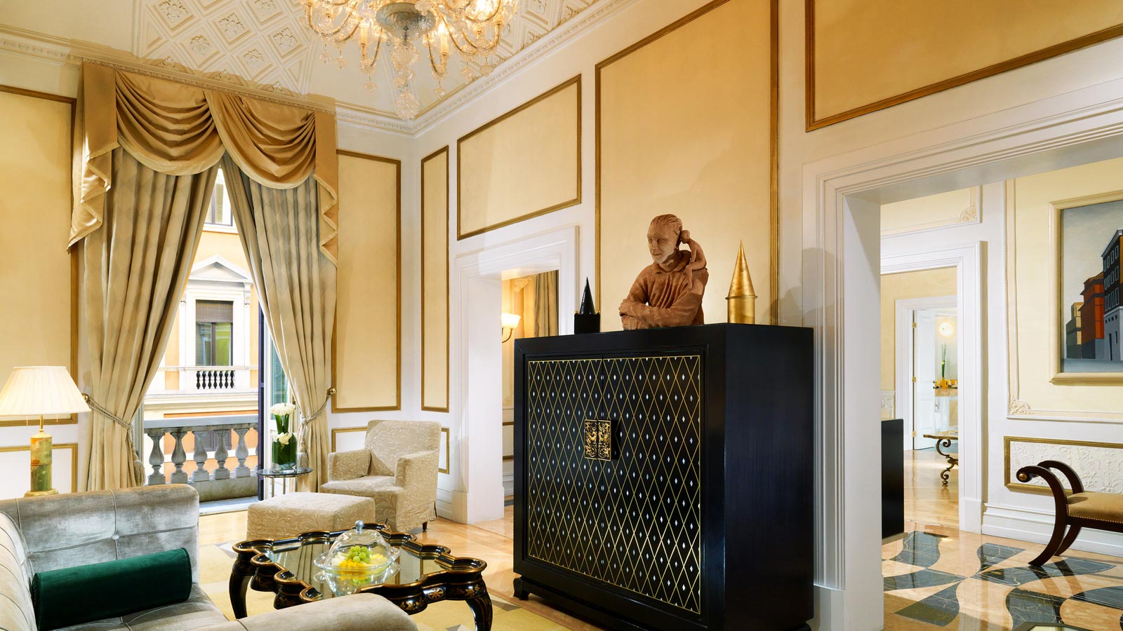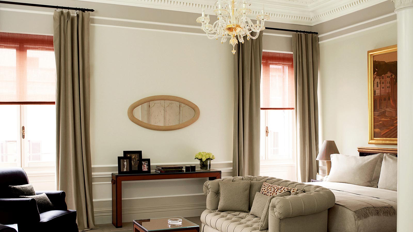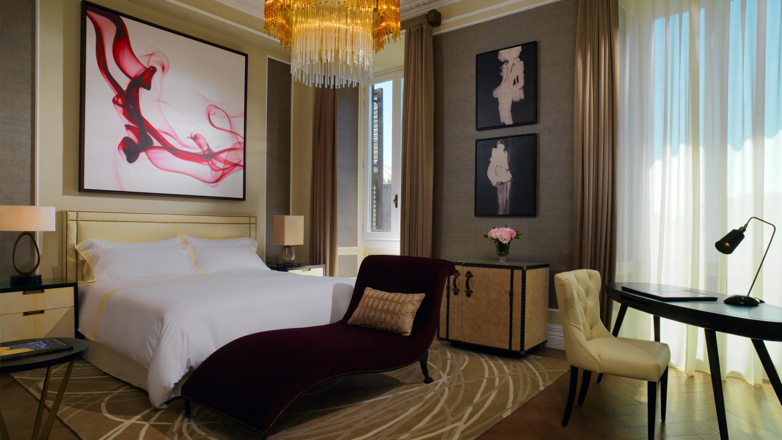 <span style="color: #a1410d;"><b>Couture Suite</b>, 80-150 м2</span>, максимум 3 гостя: был полностью разработан и спроектирован компанией HBA London в духе фильма «Римские каникулы». Вдохновленный известными студиями моды и дизайна в городе, дизайн свита представляет эксклюзивную мебель и аксессуары в лучшем итальянском стиле: частная библиотека с антологией итальянской классики кинематографа; исторические фотографии, которые напоминают о знаменитых гостях, таких как Ричард Бертон, Элизабет Тейлор и Мария Каллас ; красное струящееся полотно, создающее иллюзию красной вуали из коллекции Valentino, которое усиливает чувственное настроение Couture Suite.Роскошь проявляется в каждой детали; неофициальная, но утонченная атмосфера подчеркивается современной мебелью и тщательно подобранными аксессуарами, каждый из которых играет свою роль в создании общего впечатления. В главной гостиной имеются три больших окна с видом на город; бюст швеи в спальне вызывает в памяти традиции итальянского стиля; великолепные хрустальные люстры напоминают светящийся дождь; кушетка незатейливо примыкает к одному концу кровати.<br>