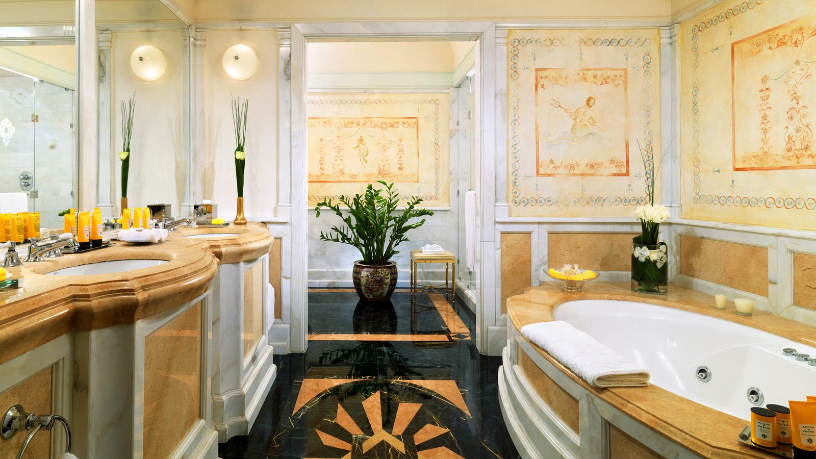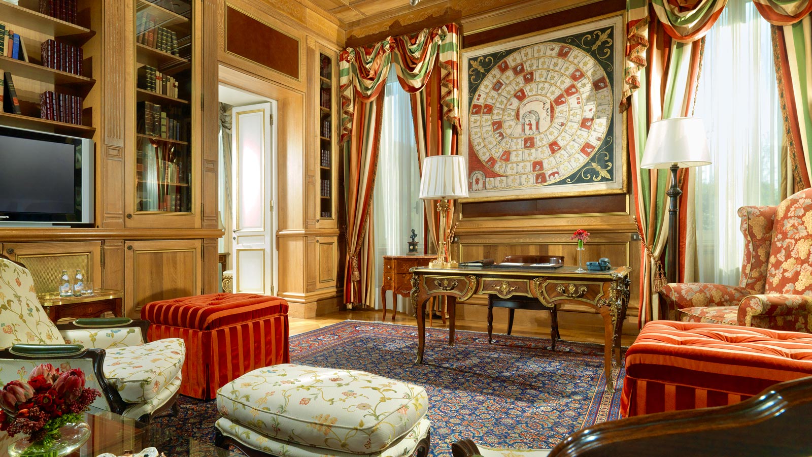<span style="color: #a1410d;"><b>Royal Suite</b>, 300 м2</span>, мааксимум 3 гостя: Являясь традиционным «вторым домом» для монархов, глав государств и знаменитостей, королеский свит излучает роскошь. Две гардеробные и отделанная мрамором ванная комната с джакузи дополняют гостевую спальню и главную спальню с широкой двуспальной кроватью, а коридор ведет в изысканную гостиную с роялем. Частная столовая с собственной кухней и винным погребом оборудована мраморным столом на 12 человек. Этот совершенный люкс оформлен в красном, золотом и зеленом цвете и украшен подлинными коврами «обюссон» и традиционной итальянской мебелью в стиле Людовика XVI.Поддерживать форму можно, не выходя из номера, с помощью беговой дорожки от Technogym©, предоставляемой абсолютно бесплатно по желанию гостей.