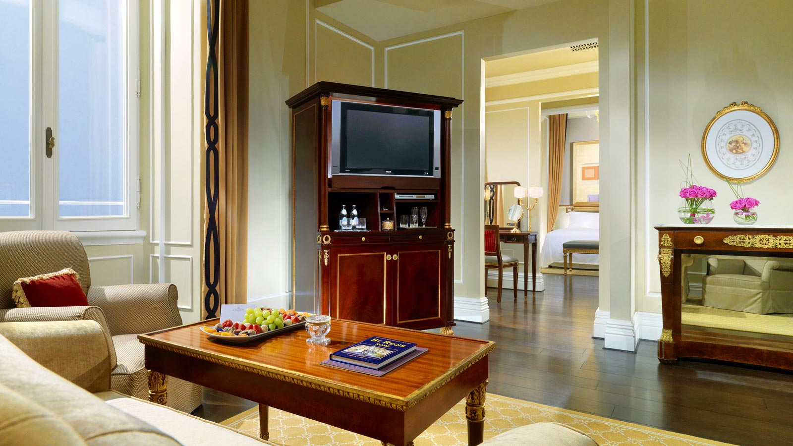 Отель St. Regis располагается в великолепном дворце, в котором собрана обширная коллекция изобразительного искусства и антиквариата. Его интерьеры являются сокровищем: украшенные ручной лепниной лестницы, «исторический» лифт, сверкающие канделябры из венецианского стекла и величественный символ La Belle Epoque — бальный зал Ritz с его прекрасными фресками.