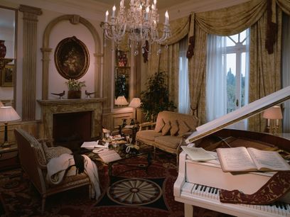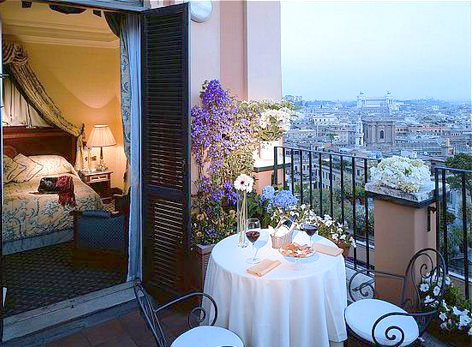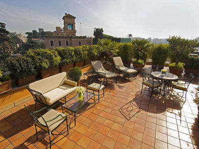 Top Suite — изысканные номер, расположенный на последнем этаже отеля, с просторной гостиной с обеденной зоной, камином, спальней, ванной комнатой, живописной террасой с панорамным видом на Рим.