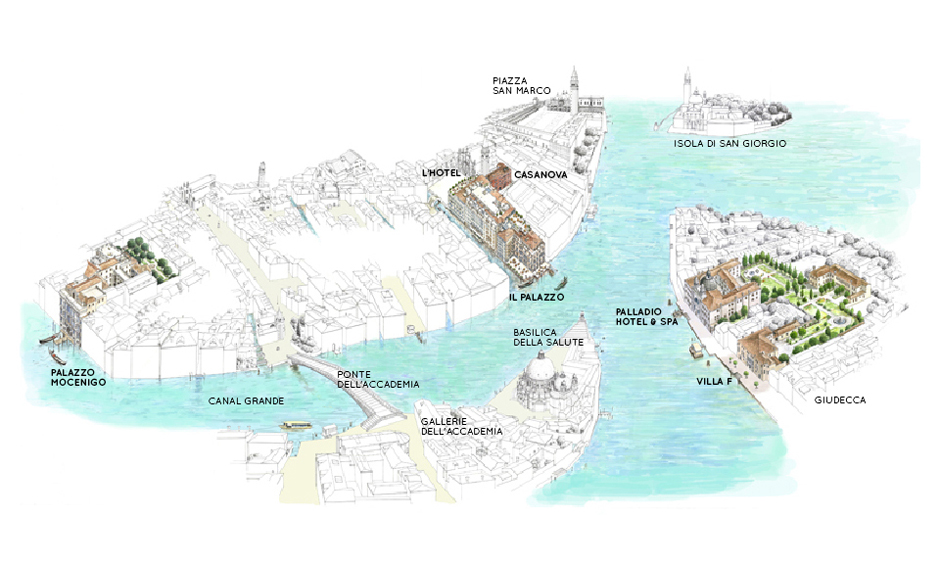 Знаковый гурме-ресторан De Pisis предлагает блюда международной и средиземноморской кухни, вид из ресторана открывается на Большой Канал; есть терраса. Между отелями Il Palazzo и Palladio, Villa F ходит катер, чтобы гости отелей могли презжат в роскошные рестораны Il Palazzo или в спа Palladio.