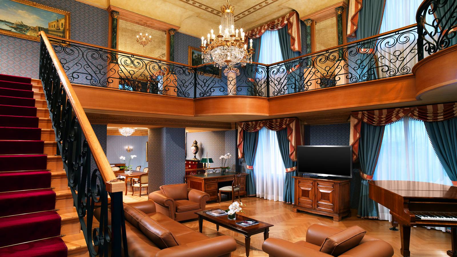 Шикарный номер Presidential Suite создан для роскоши и уюта и представляет собой двухуровневый угловой номер, расположенный на 8 и 9 этажах. Номер располагает прекрасной террасой. Номер декорирован антикварной мебелью, люстрами и лампами из муранского стекла, дорогими тканями, располагая роялем и мраморными ванными комнатами.