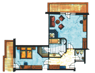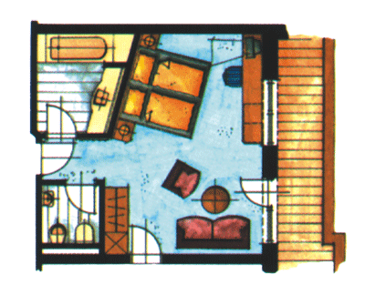 Suite Deluxe Gardena (75 кв.м) - прихожая, просторная гостиная с тирольской печь, два балкона, два телевизора, телефон в каждой комнате, раздельный санузел, ванная комната с душем и ванной, две раковины, сауна, косметическое зеркало.