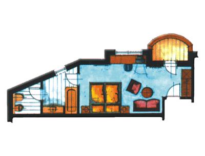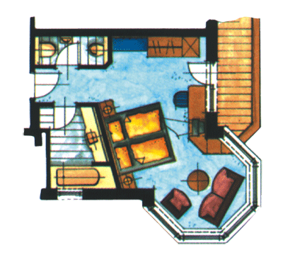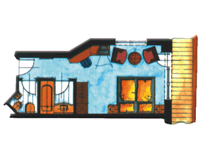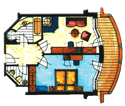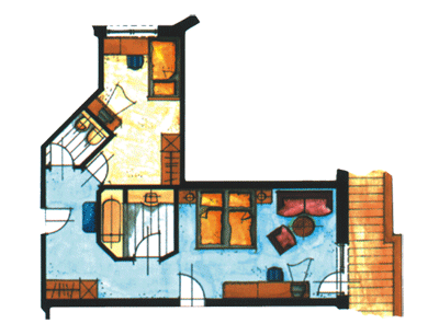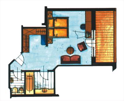 Type C-Suite (55 кв.м) — в номерах — прихожая, отдельная гостиная с майоликовой печью, мягкой мебелью; спальня, ванная комната, в спальне и гостиной — балконы с видом на город.