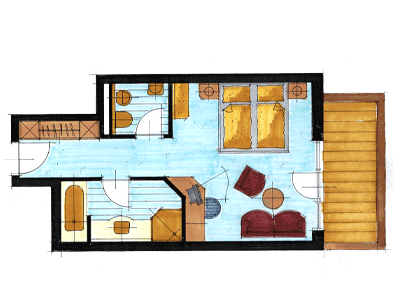 Номера: Роскошные интерьеры, оформленные в тирольском стиле с отделкой светлым деревом, с удобствами, телевизором, сейфом, минибаром, феном, есть номера Супериор ( 30 – 40 кв. м ), Сьюты де Люкс ( 50 – 55 кв. м): с балконом и с видом город – площадь примерно 55 кв.м. Роскошный сьют с холлом, с камином-печью и балконом, спальня с балконом. Письменный стол и ТВ, минибар, сейф, телефон в холле, спальне и ванной. Радио в холле, спальне и ванной. Выход в интернет. Ванная комната с ванной, душем, двойным умывальником, феном, косметическим зеркалом; Suite De Luxe Gardena (до 75 кв. м ). Из всех номеров открывается великолепный вид на город, либо в сад.
