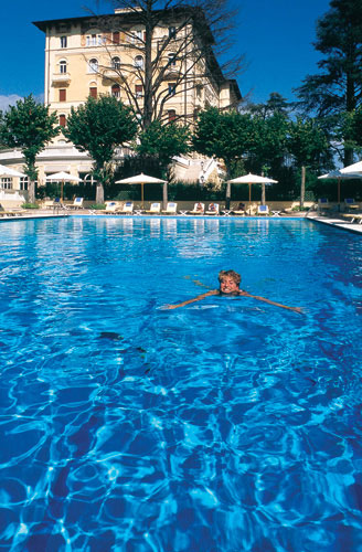 Отель Grand Hotel Palazzo della Fonte - лучший на курорте и один из лучших отелей в Европе. Построенный в эпоху "серебряного века" в 1912 году, отель недавно был полностью реконструирован. Расположен на высоте 750м рядом с вековым парком, раскинувшимся на восьми акрах. Сам городок окружен многочисленными средневековыми замками. Номера с высокими потолками создают ощущение домашнего уюта и дают возможность насладиться прекрасными видами на старый город, парк или горы. Отель оформлен и сохраняет чарующую атмосферу загородного английского поместья. Холл, коридоры и залы впечатляют своими размерами, а также красочным и грациозным декором. Мрамор, лепнина, резьба по дереву, антикварная мебель и картины, люстры из муранского стекла, парча и роскошные ковры создают изысканную атмосферу эксклюзивности, воссоздавая блестящую обстановку прежних времен.