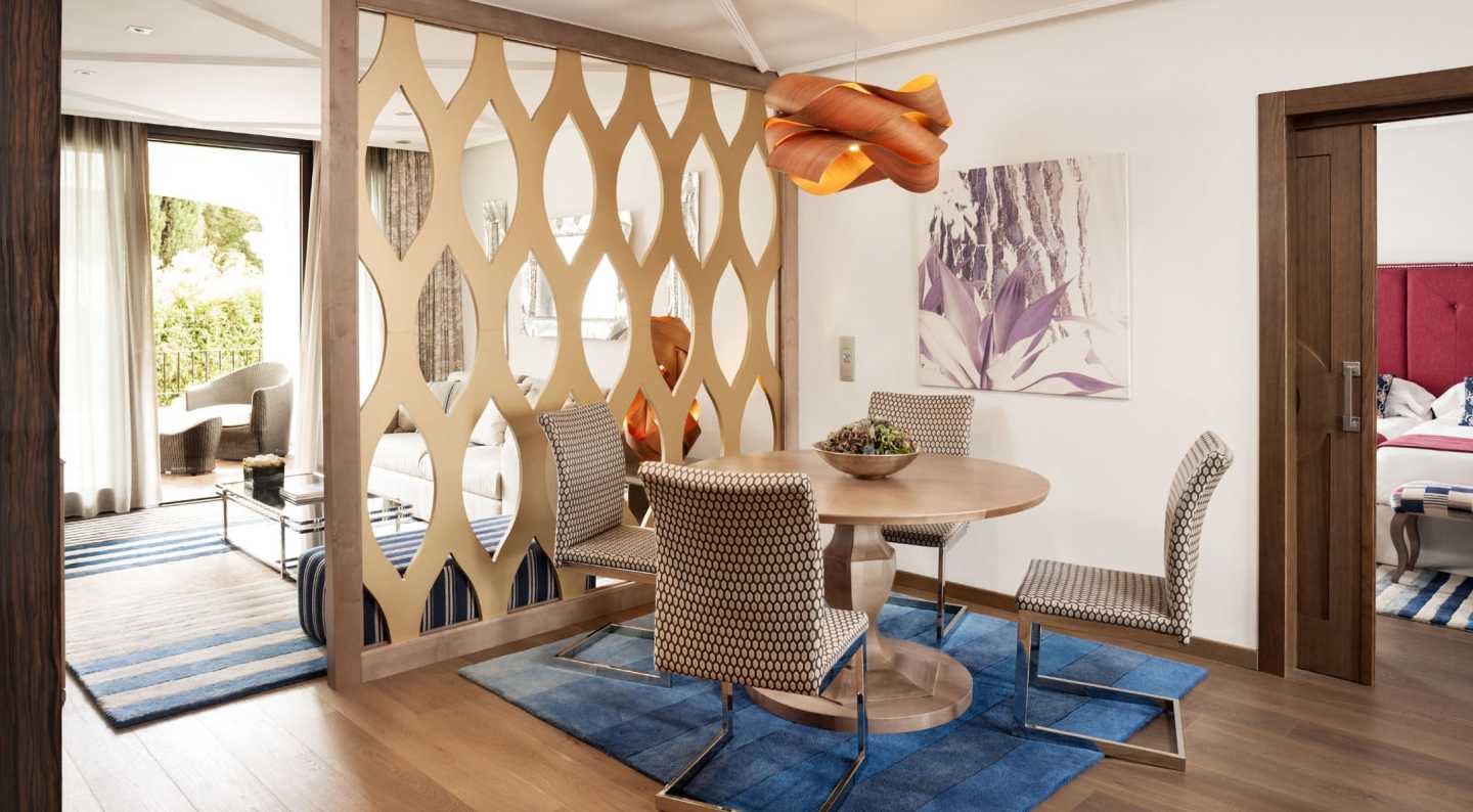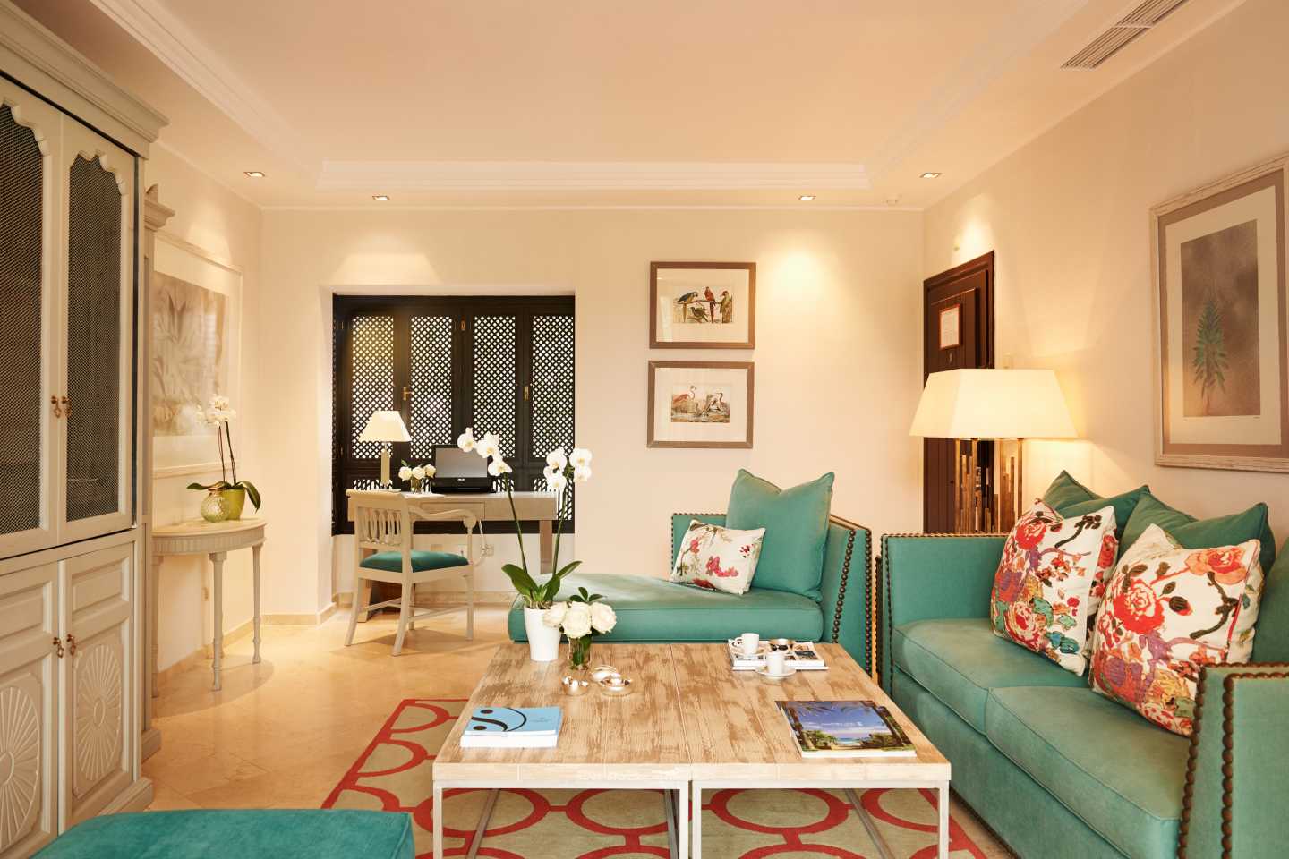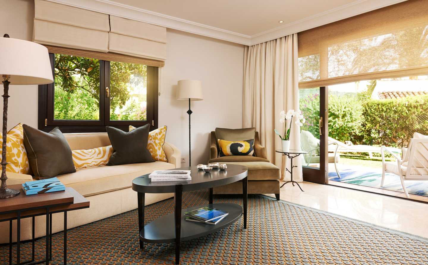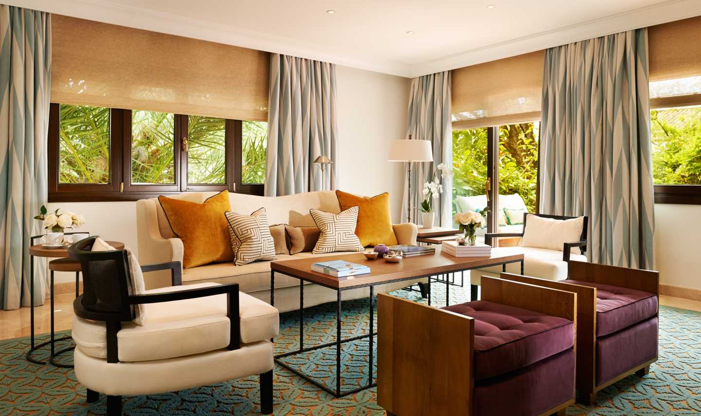 Deluxe Garden Suite 70м2 - номера в средиземноморском стиле. Просторная гостиная с диваном, кофейным столиком, круглым обеденным столом на 4 персон. Ванна отделана мрамором. Терраса с видом на сад.