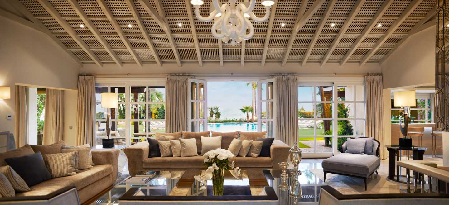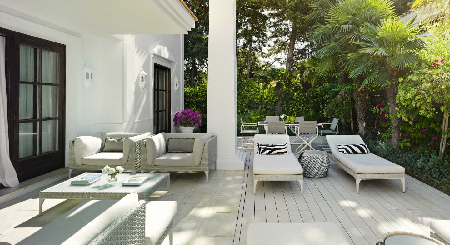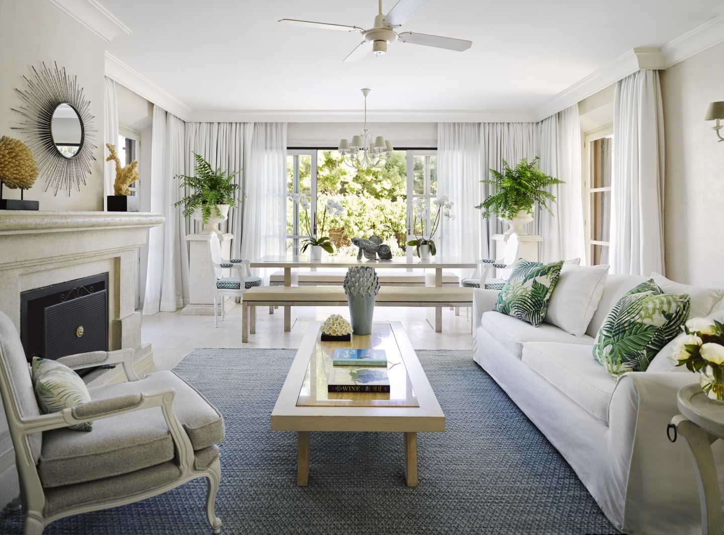 Deluxe Garden Suite 70м2 - номера в средиземноморском стиле. Просторная гостиная с диваном, кофейным столиком, круглым обеденным столом на 4 персон. Ванна отделана мрамором. Терраса с видом на сад.