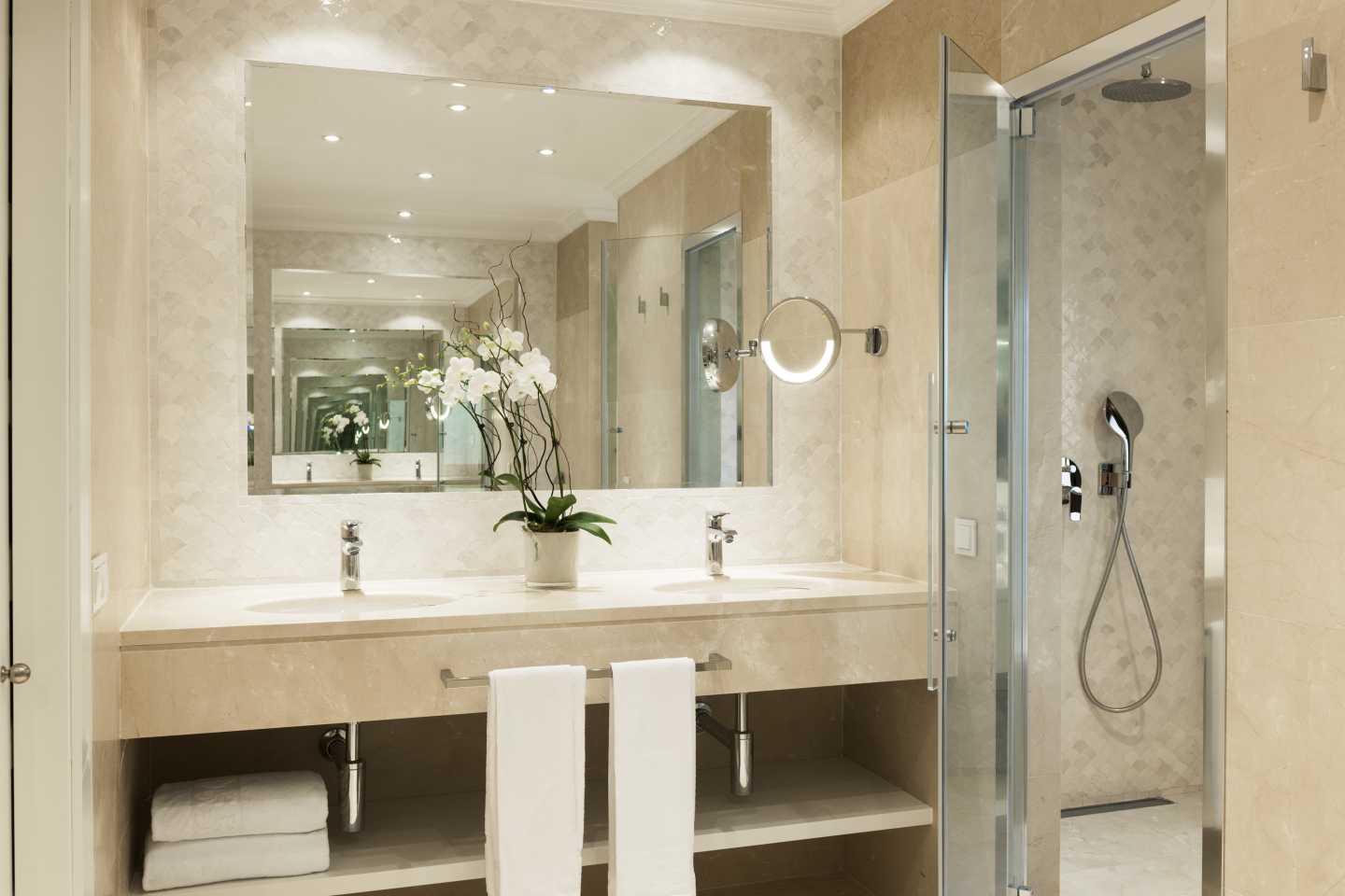Imperial Suite 90м2- номер на последнем этаже виллы у пляжа. Здесь особенно хорош вилы на море с террасы, гостиная просторная и уютная, спальня элегантная, а ванна отделана мрамором.