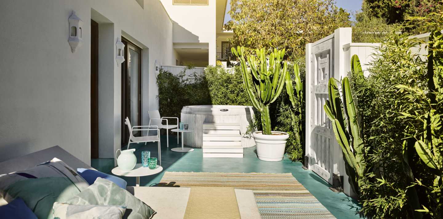 Junior Suite 50м2 - номер с террасой и видом на сад, недалеко бассейн. Просторная гостиная, мраморная ванна, отдельный душ.