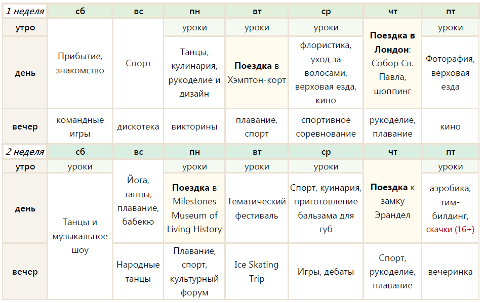- 2 экскурсии в неделю