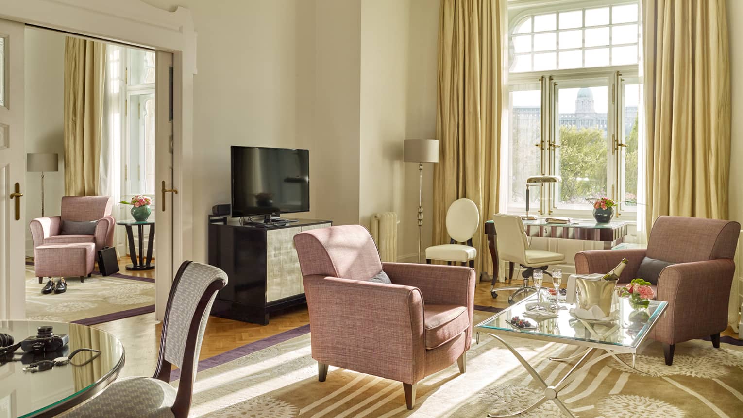 Royal Suite: 136 м2. Расположен на 2 этаже, выходит на Дуная, Королевский Дворец, Цепной мост, холмы Буды и Рыбацкий бастион; оформлен в стиле Арт Деко и украшен произведениями искусства эпохи Art Nouveau; состоит из спальни с кроватью king-size, гостиной, столовой, ванной комнаты с ванной и отдельной душевой кабиной, гостевой туалетной комнаты, большого меблированного балкона с панорамным видом на город. Максимальное размещение — 3 взрослых или 2 взрослых+1 ребенок. Возможно присоединение второй спальни с ванной комнатой.