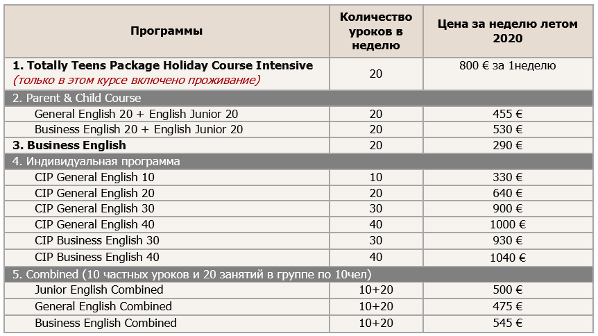 a) C.I.P. Business English 30 (Crash Intensity Programme) – 30 индивидуальных уроков в неделю. Уроки проходят с 09.00 до 15.00 с понедельника по пятницу. В стоимость курса включено: Регистрационный сбор, учебник, inlingua пакет (набор канцелярских принадлежностей), свежая газета и билет на еженедельную экскурсию (в соответствии с расписанием, обновляющимся еженедельно)