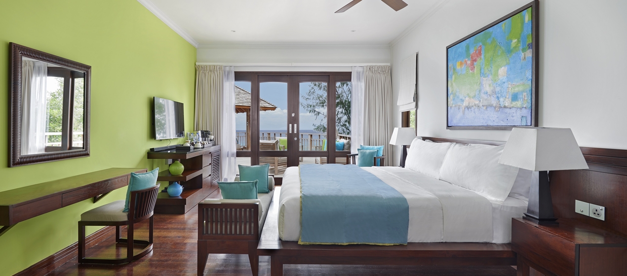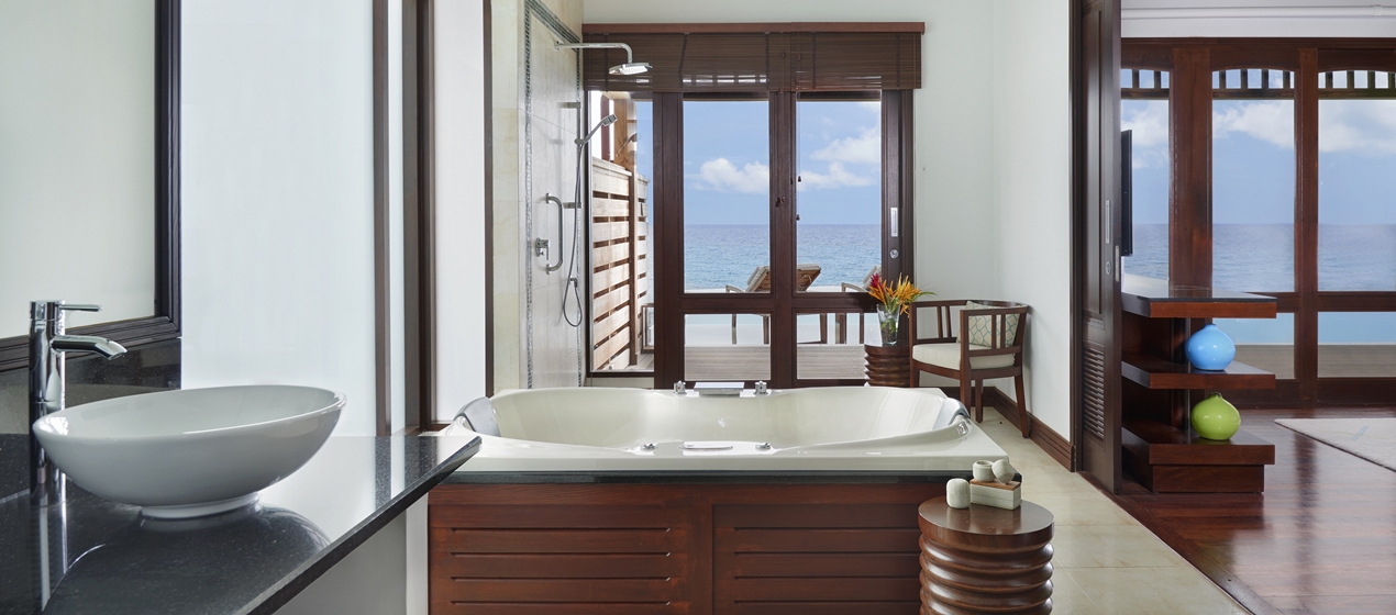 <span style="color: #7b3000;"><b>Deluxe Oceanfront Villa</b></span>: 90 м<sup>2</sup>, расположена рядом с пляжем, на сваях у воды; состоит из спальни с кроватью под пологом, гостиной зоны, ванной комнаты с джакузи, балкона с видом на океан. <br>