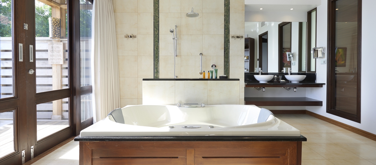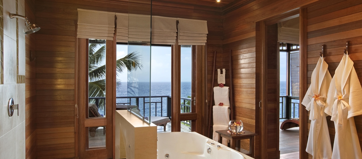 <b><span style="color: #7b3000;">Ocean View Hillside Villa</span></b>: 90 м<sup>2</sup>, расположена на склоне холма, на сваях среди пышного тропического леса; состоит из спальни с кроватью под пологом, зоны отдыха, ванной комнаты с джакузи, балкона с видом на лес и океан. <br>