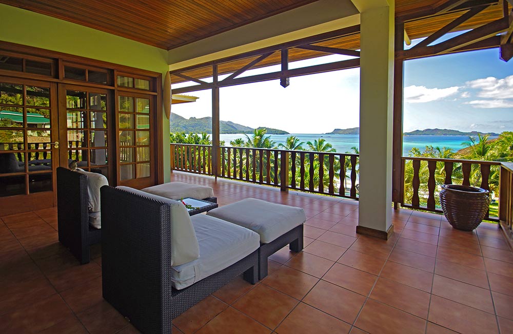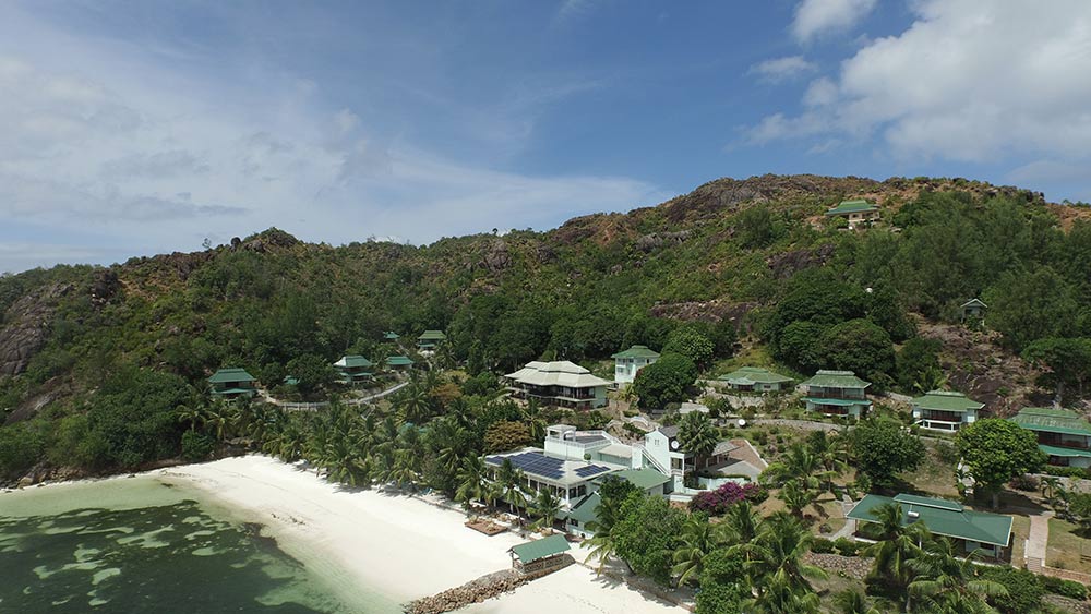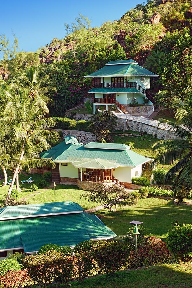 Вид из окон бунгало отеля открывается на тропическую зелень острова и пляж Анс Гувернеман.