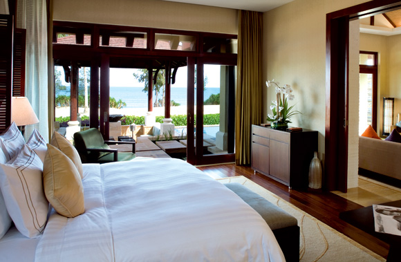 Three Bedroom Ocean Front Villa: помещения — 367 м2, общая площадь — 583 м2. Расположена в саду, рядом с пляжем, состоит из гостиной, кухни, 3 спальни, 3 ванных комнат, дополнительной туалетной комнаты, террасы с собственным бассейном и беседкой, выходит на залив. В номере — MP3/IPOD, косметика от Bvlgari.