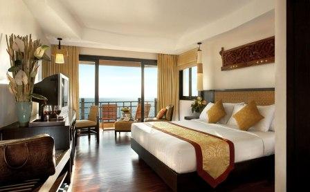Seaview Deluxe Room (45 кв.м): кровать king-size или две кровати twin, небольшая гостиная зона с диваном и журнальным столом, ванная комната с ванной и душевой кабиной, балкон.