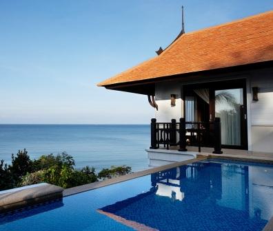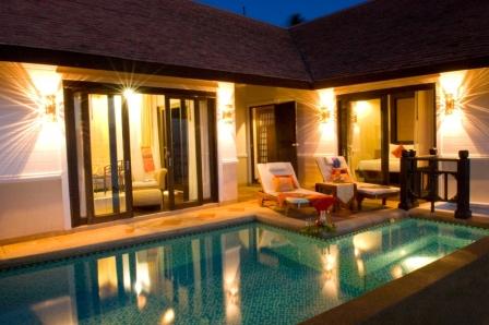 Sunset Pool Villa (100 кв.м): спальня с кроватью king-size, отдельная гостиная с диваном и зоной для отдыха, музыкальный центр, ванная комната с ванной, душевой кабиной и двумя раковинами, терраса с собственным бассейном и джакузи.