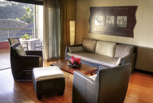 Интерьеры номеров, расположенных в главном здании или в бунгало на воде, выполнены в традиционном полинезийском стиле.