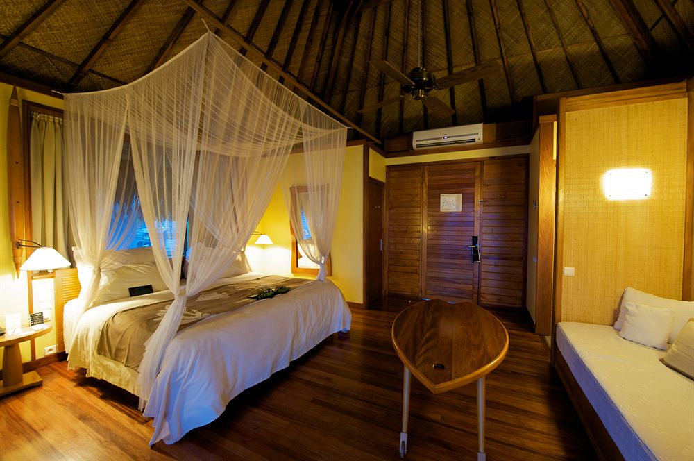 Курортный отель Le Meridien Tahiti предоставляет гостям фешенебельные номера с видом на сад или лагуну, а также уединенные бунгало, построенные прямо над водой.