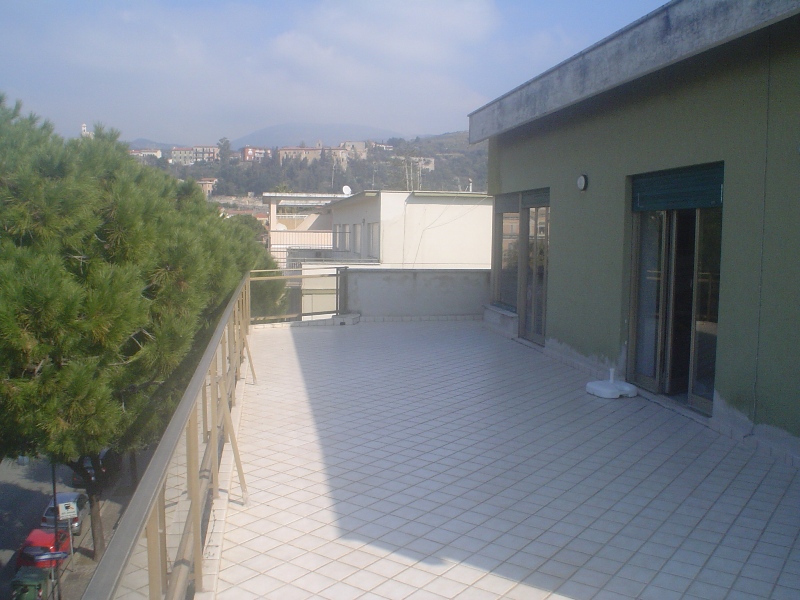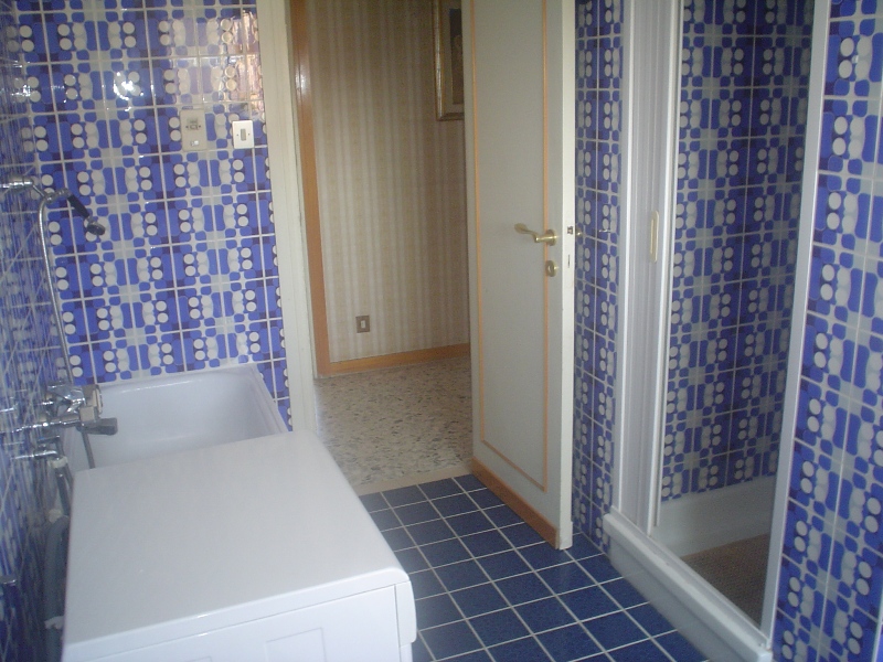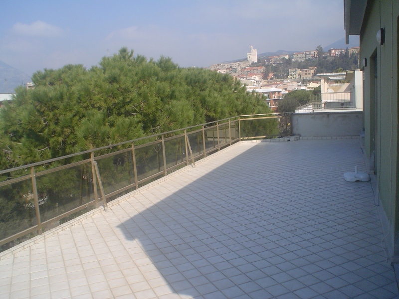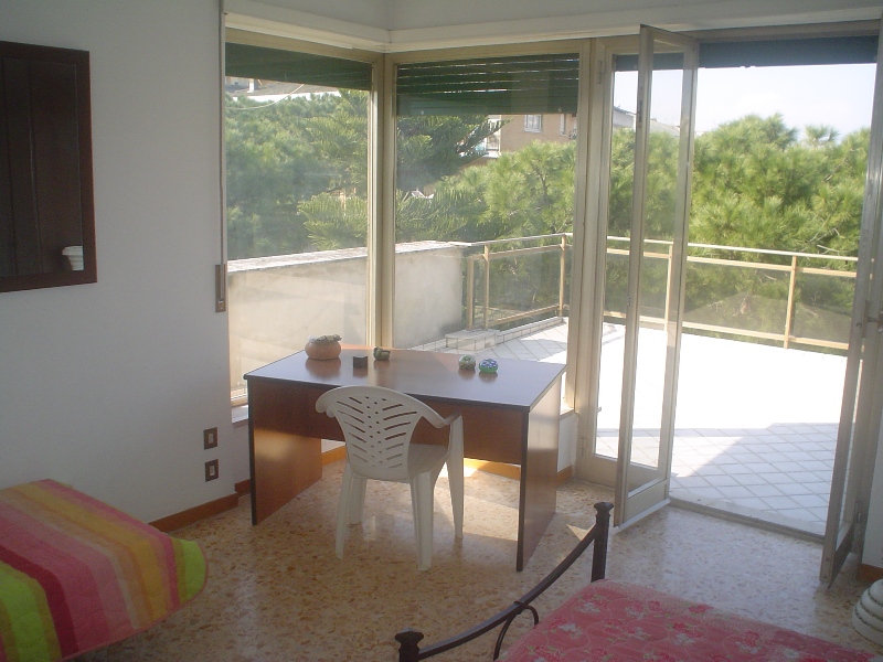Из зала и из спальни есть большой застекленный выход на террасу, откуда открывается вид на тенистый проспект – виале Виттория..
