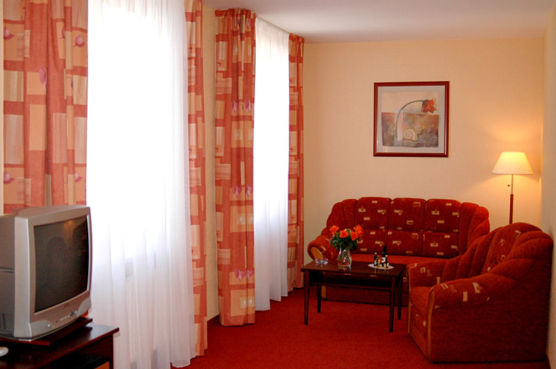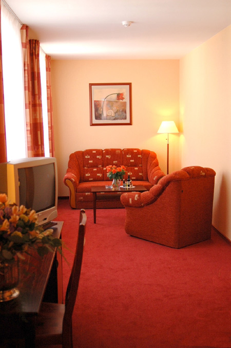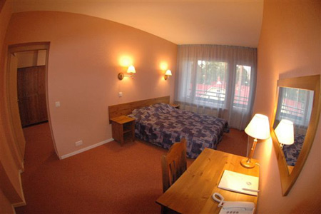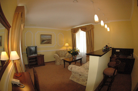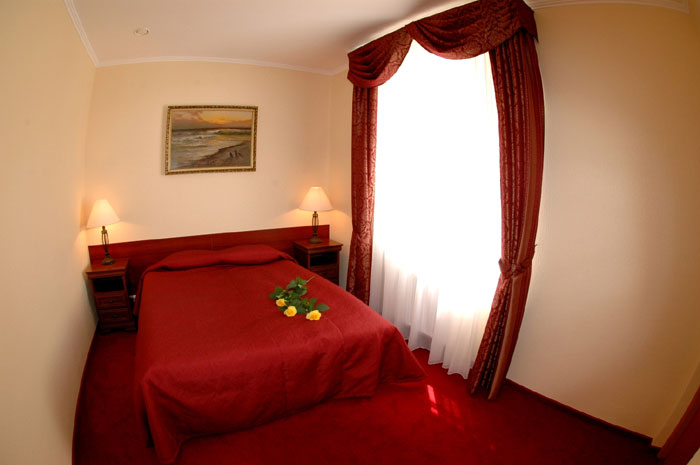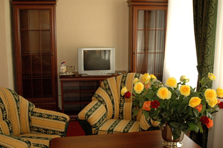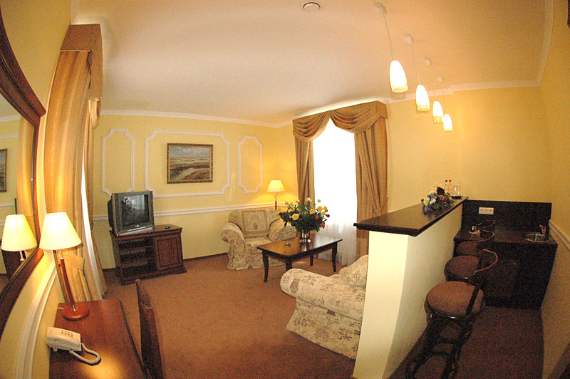 Номер Люкс в корпусе бизнес класса Двухкомнатный номер 39 – 46 м2, большая общая кровать, диван для отдыха, который можно использовать как дополнительную кровать. Номер оборудован ванной комнатой, встроенным шкафом, прессом для брюк, кондиционером воздуха, сателитным и платным телевидением, прямой телефонной линией и минибаром.