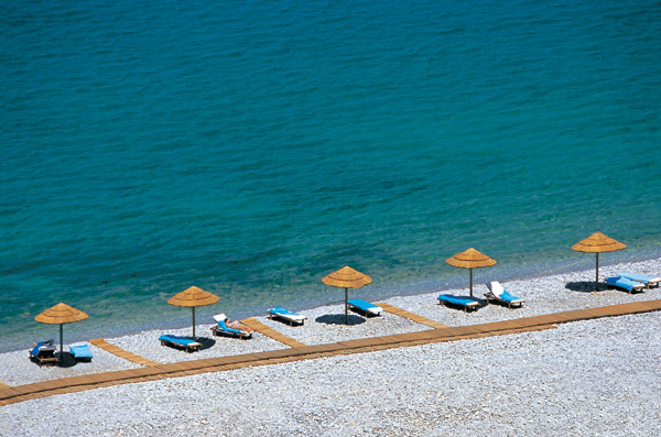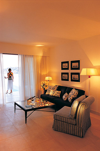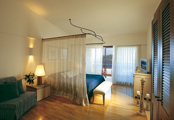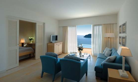 Island Luxury Suite Sea View & Private Heated Pool: 72 м2. Каждый из номеров этой категории назван в честь определенного греческого острова и имеет индивидуальный интерьер; состоит из просторной гостиной, спальни, ванной комнаты с джакузи и отдельной душевой кабиной, 2 гардеробных, террасы с зоной отдыха и собственным подогреваемым бассейном (30 м2), выходящей на море.