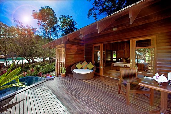 Deluxe Villa: 108 м2; состоит из спальни с кроватью king size, просторной гостиной, ванной комнаты с душевой, балкона с видом на джунгли и море.