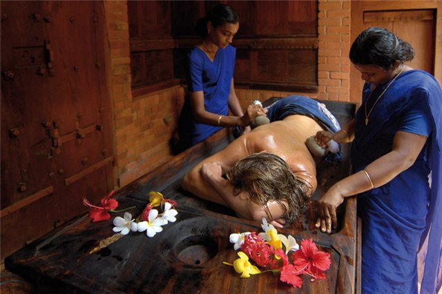 - Njavarakizhi (Ньяваракизхи) - процедура, в течение которой все тело или любая определенная его часть потеют под воздействием наложения определенных, наделенных медикаментозным воздействием, субстанций в форме шариков, плотно расфасованных в марлевую повязку. Эта работа производится с помощью двух или четырех ассистентов в течение 14 дней, приблизительно по 60 - 90 минут в день. Этот вид лечения очень эффективен для всех типов ревматизма, общего истощения, болях в суставах, кровяном давлении, повышенном холестерине и определенных видах кожных заболеваний;