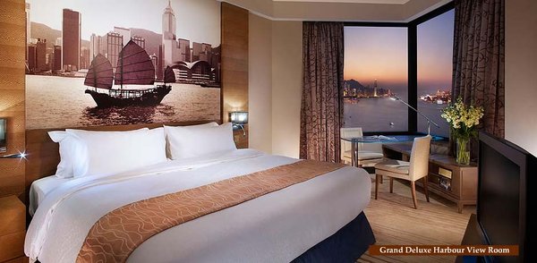 Grand Deluxe Harbour View Room: 31 м2; состоит из спальни с кроватью king size или двумя кроватями twin, ванной комнаты; номер с панорамным видом на районы Central, Wanchai и Causeway Bay, гавань Виктория и на полуостров Kowloon. Максимальное размещение — 3 взрослых или 2 взрослых + 1 ребенок.