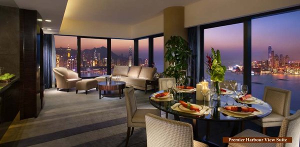 Premier Harbour View Suite: 94 м2; эксклюзивный угловой номер; состоит из спальни с кроватью king size или двумя кроватями twin, просторной гостиной со столовой зоной, ванной комнаты, помещения для дворецкого (во многих номерах); номер с панорамным видом на район Central, гавань Виктория и на полуостров Kowloon. Максимальное размещение — 3 взрослых или 2 взрослых + 1 ребенок.