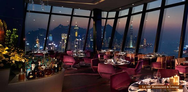 Ресторан с гостиной и баром Le 188° с трех сторон окружен окнами от пола до потолка с поистине впечатляющим видом на бурлящий Гонконг и предлагает замечательное меню европейской кухни.