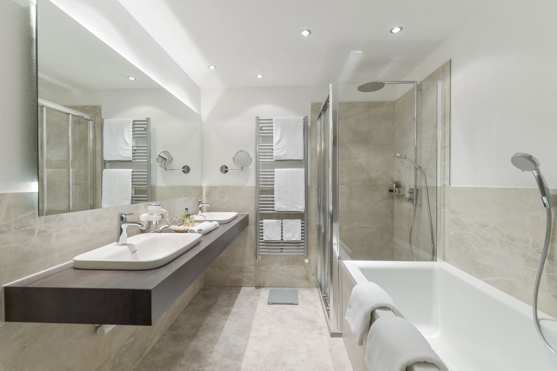 Panorama Suite: 50 м2. Состоит из двух спален, одна из которых с гостиной зоной с тирольской печью, двух ванных комнат с ванной или душем, туалетной комнаты.