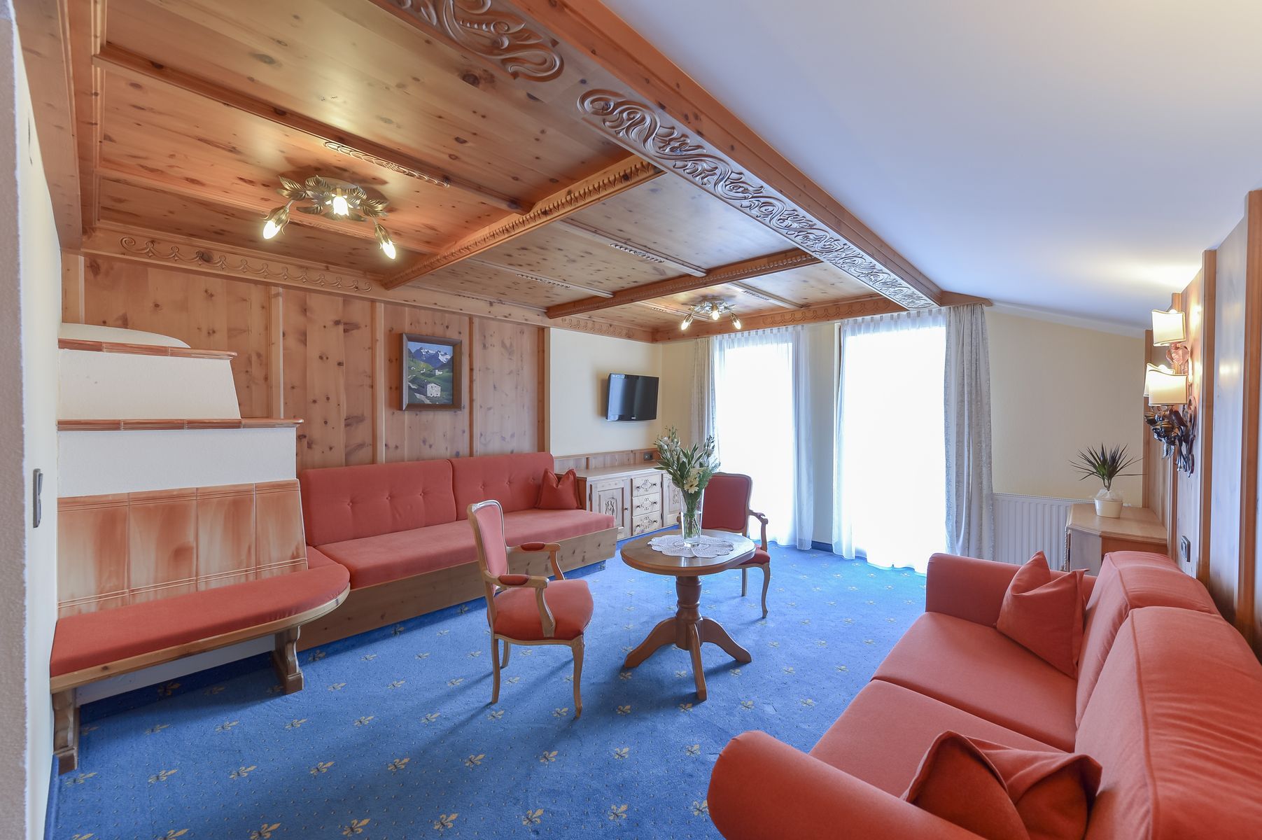Regina Suite: 45 м2. Состоит из спальни, гостиной с тирольской печью, ванной комнаты с ванной и/или душем, балконом. В некоторых номерах спальня и гостиная зона разделены.