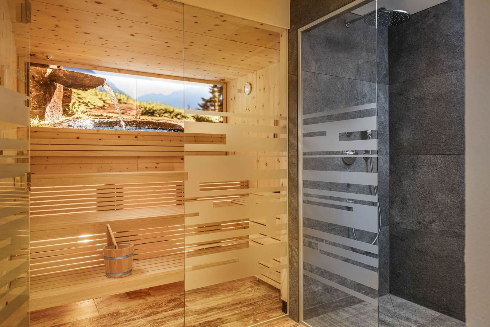 Luxury Family Suite: 60 м2. Состоит из двух спален, ванной комнаты с ванной и душем, сауны, просторной гостиной с тирольской печью, балкона.
