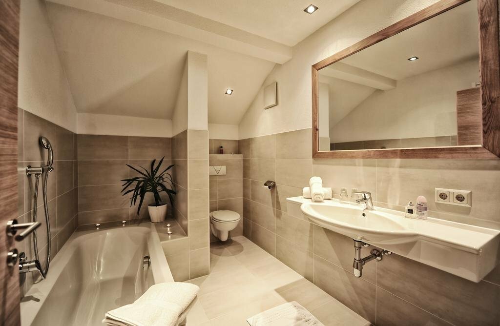 Alpensuite Typ 6: 45 м2. Состоит из главной спальни с двуспальной кроватью и гостиной зоной, второй спальни с односпальной кроватью, ванной комнаты с ванной и отдельным душем, балкона с видом на город и горы.