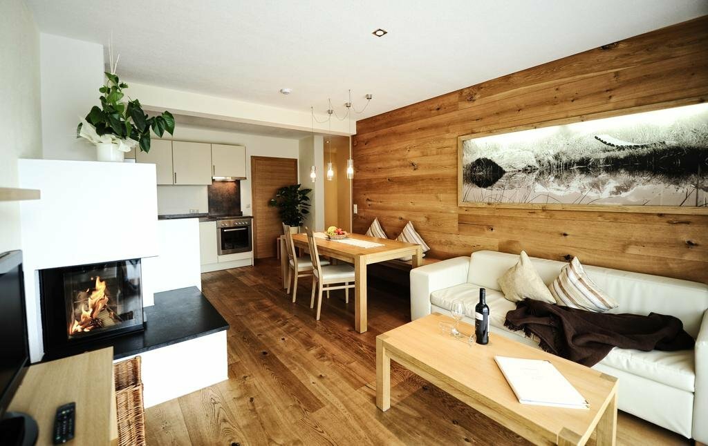 Alpine Suite Typ 3: 70 м2. Состоит из прихожей, двух спален, гостиной зоны с тирольской печью и обеденной зоной, ванной комнаты с ванной, гостевой уборной с душем, балкона.