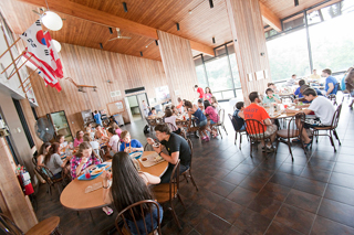Питание. Большой зал, где студенты обслуживают себя сами. Широкий выбор горячих и холодных блюд, салатов, фруктов и десертов.