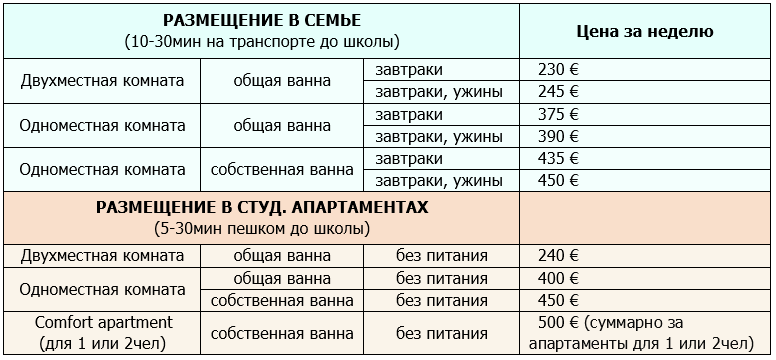 Питание: для проживающих в семье - завтраки ИЛИ полупансион, для проживающих в резиденции или апартаментах - без питания.