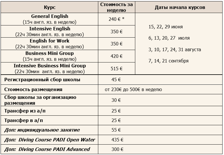 6*. Курс 30+ (General English, Intensive English, English for work) - в высокий сезон для студентов возраста от 30 лет, формируются группы в соответствии с возрастом, без дополнительной оплаты. В группе не будет студентов моложе 30 лет (применимо ко всем курсам, названным выше).