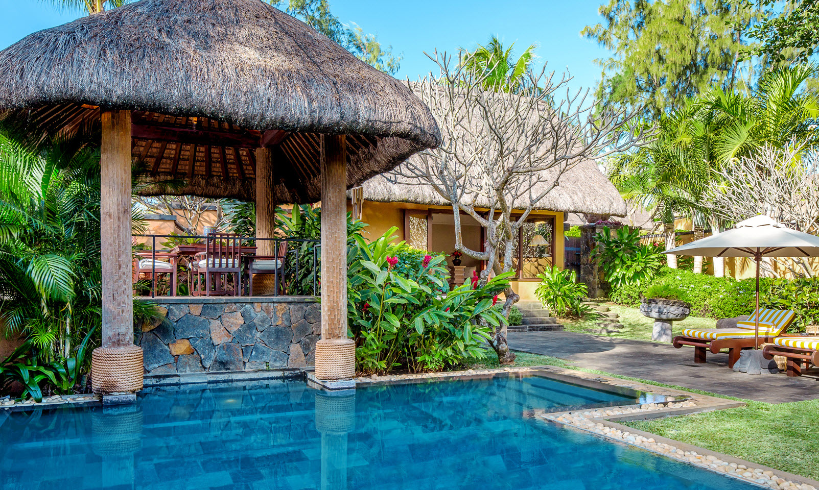 Luxury Pavilion: прибл. 70 м2, состоит из спальни с кроватью king-size или двумя кроватями twin, гостиной зоны, ванной комнаты, гардеробной, террасы с небольшой обеденной зоной и видом на океан и сады. Максимальное размещение - 2 взрослых + 2 ребёнка (0-7 лет) или 2 взрослых + 1 ребёнок (8-11 лет) (ставится 1 дополнительная кровать).