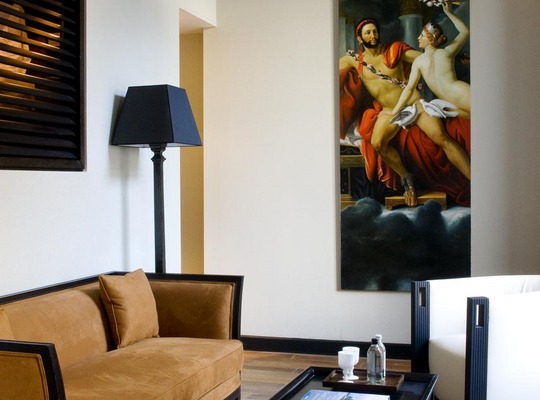 Jacques-Louis David Suite: 66 м2. Двухуровневый номер, украшенный репродукциями полотен Жака-Луи Давида, состоит из спальни, гостиной, обеденной зоны, мини-кухни, ванной комнаты.