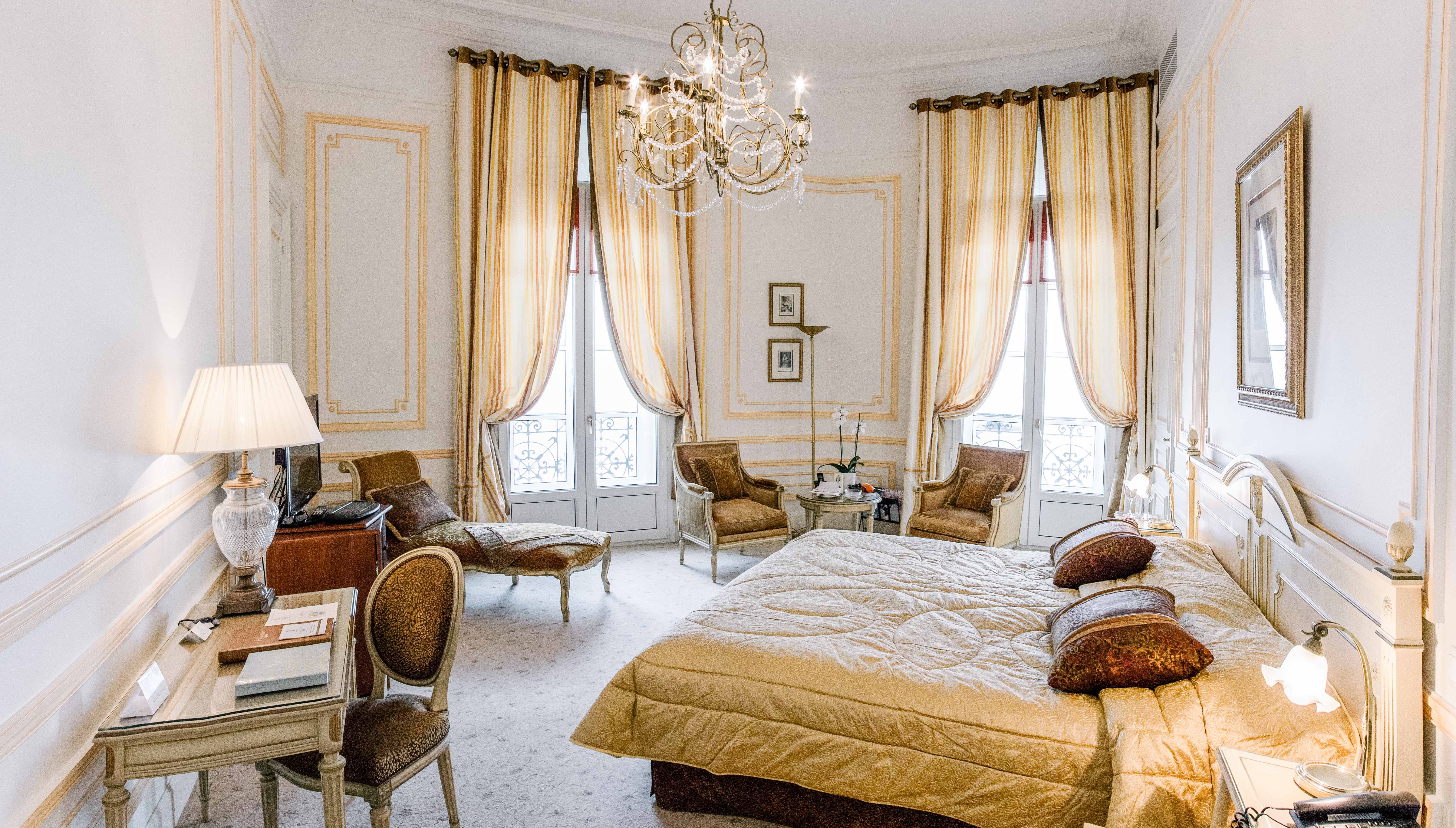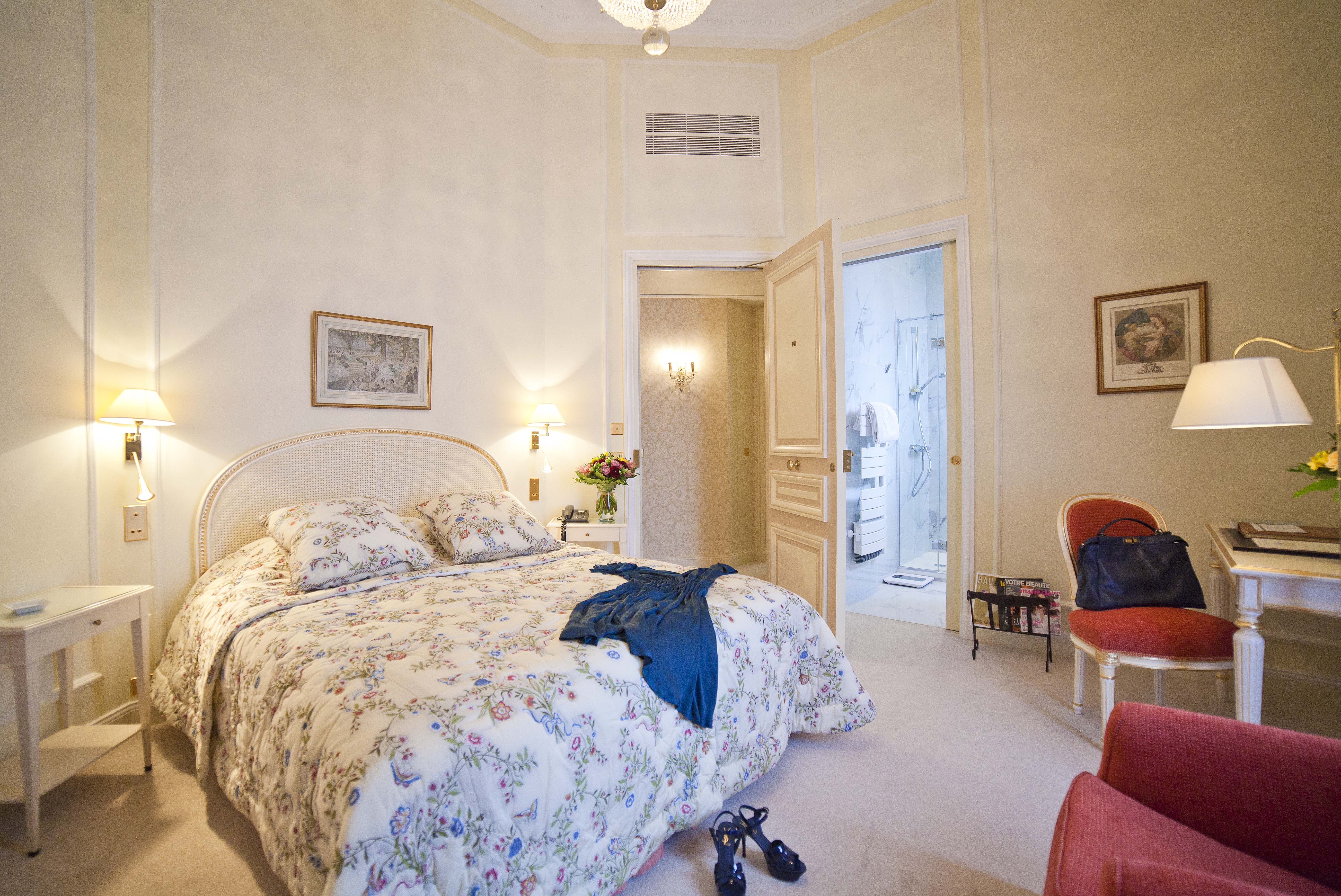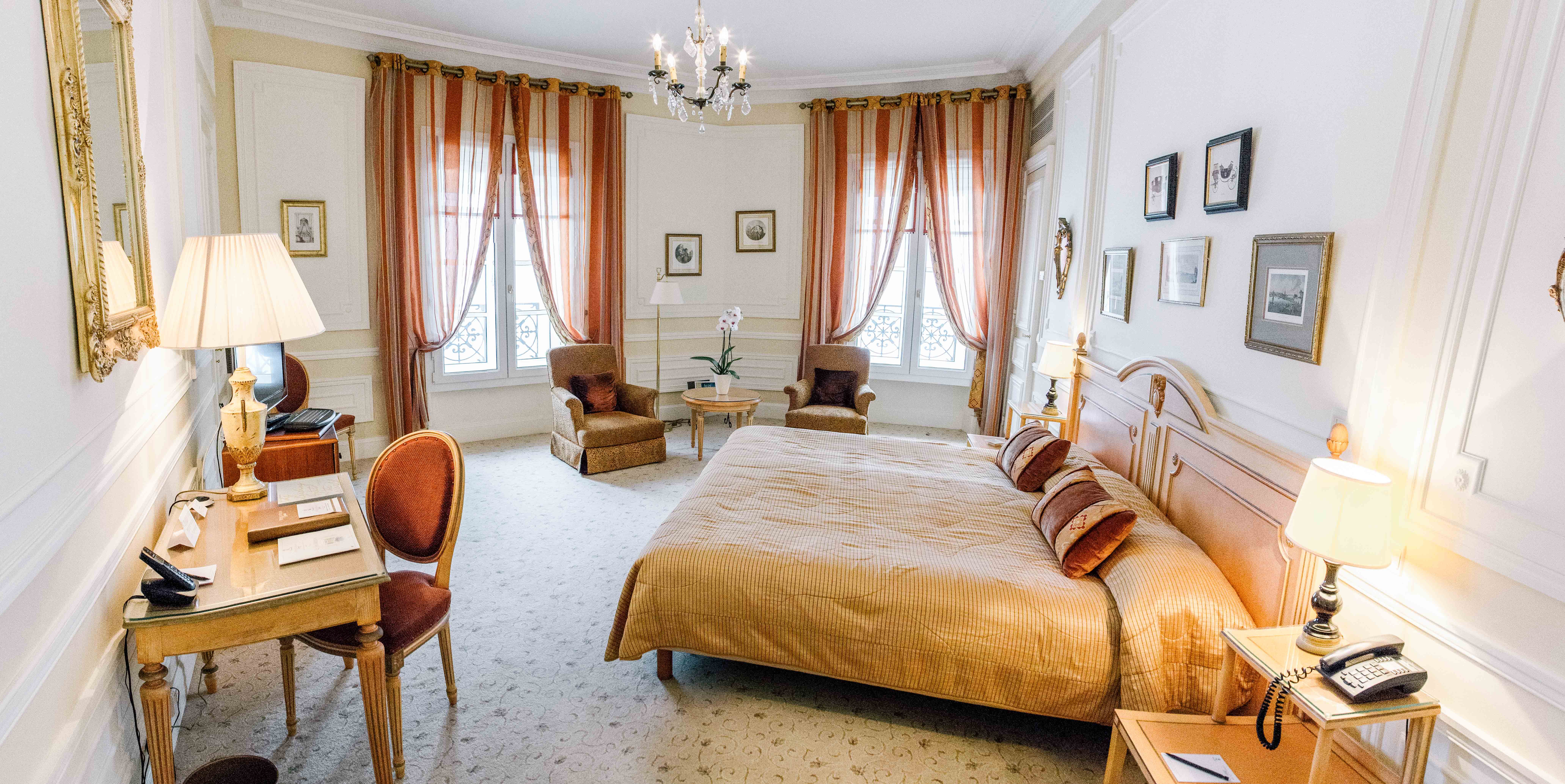В отеле номера различных категорий, включая Rooms и Suites. Номера оформлены в светлых тонах. Их отличают потолки с художественной лепниной, большие окна, уютные диваны и кресла, а также изысканная мебель в стиле ампир. Комнаты 1-3 этажей носят исторический облик: в них бережно сохраняют подлинный классический дворцовый стиль эпохи Наполеона III.