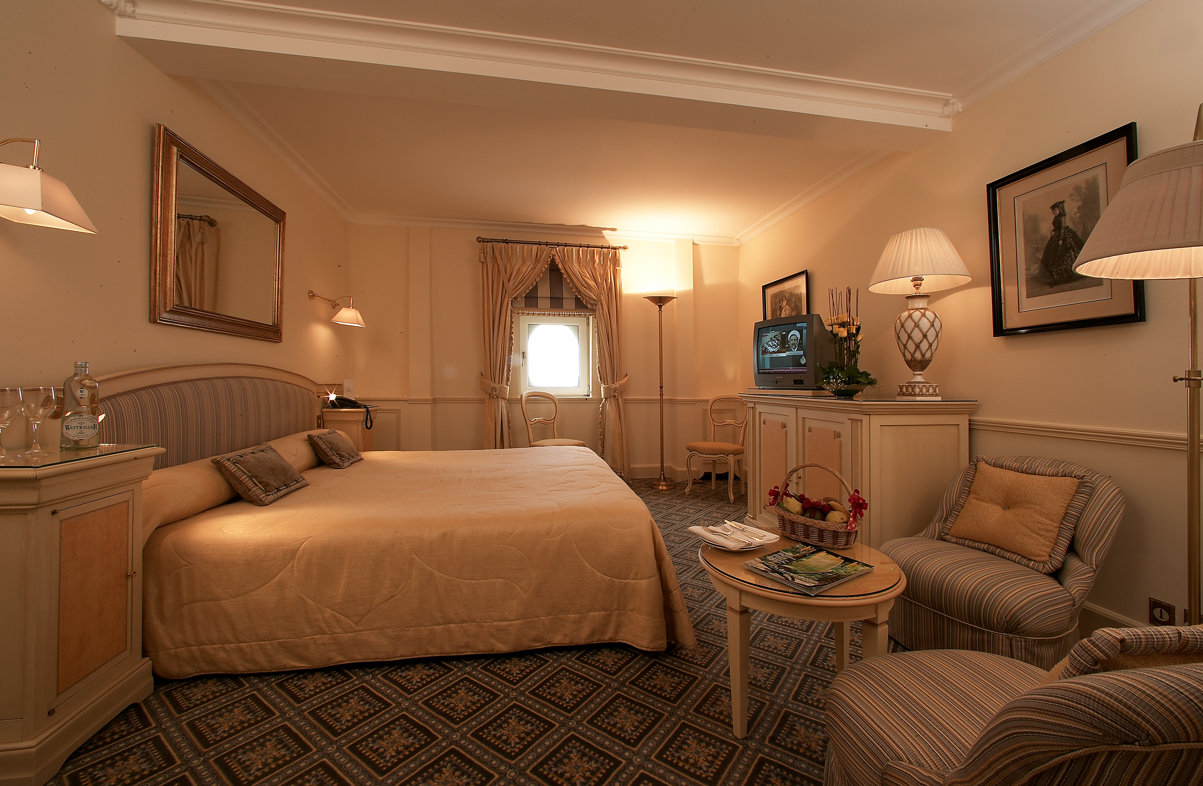 Imperial Suite “Impératrice Sissi”: Апартаменты, созданные в честь одной из самых любимых героинь в Европейской истории, выполнены в нежных бежевых и белых тонах. Дизайнеры постарались полностью воспроизвести стилистику и богемную атмосферу давно ушедшей эпохи, соединив воспоминания о прекрасной Сиси с роскошью старых и новых вещей, мешая века и стили. Спальня выдержана в цвете слоновой кости. Дамасский шелк, лепнина и росписи на стенах с небольшими вкраплениями сусального золота. В салоне одна стена украшена большими зеркалами, скрывающими домашний кинотеатр с аудиосистемой. Они расположены прямо напротив выхода на террасу и создают иллюзию окон, таким образом, расширяя пространство. Ванная комната, обустроенная в соответствии со всеми современными требованиями, оформлена нежно зеленым каррарским мрамором и пестрой стеклянной мозаикой на итальянский манер.